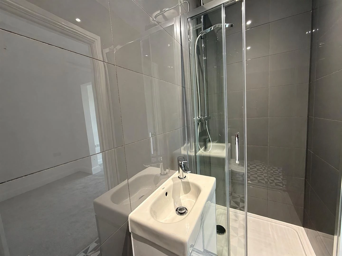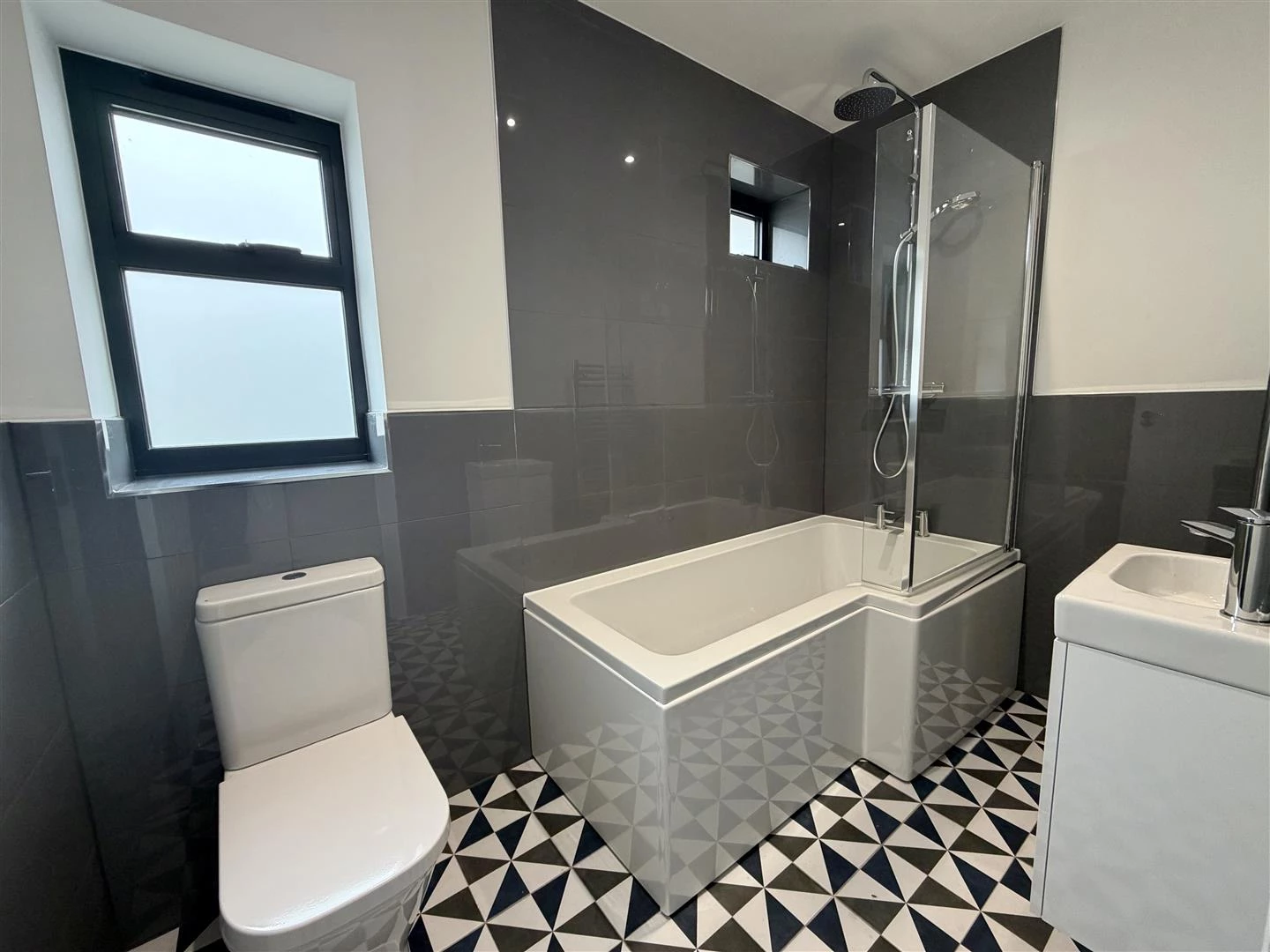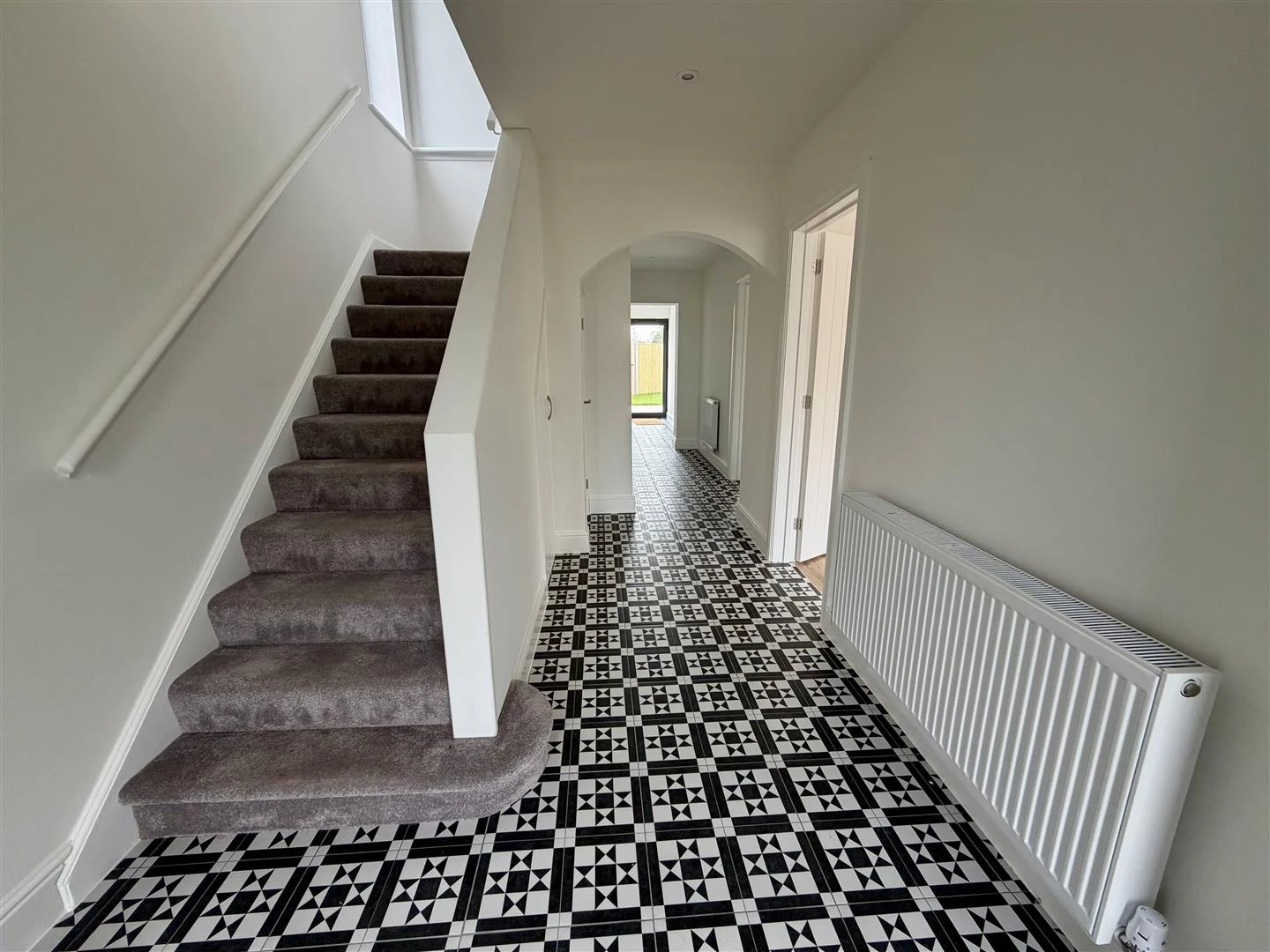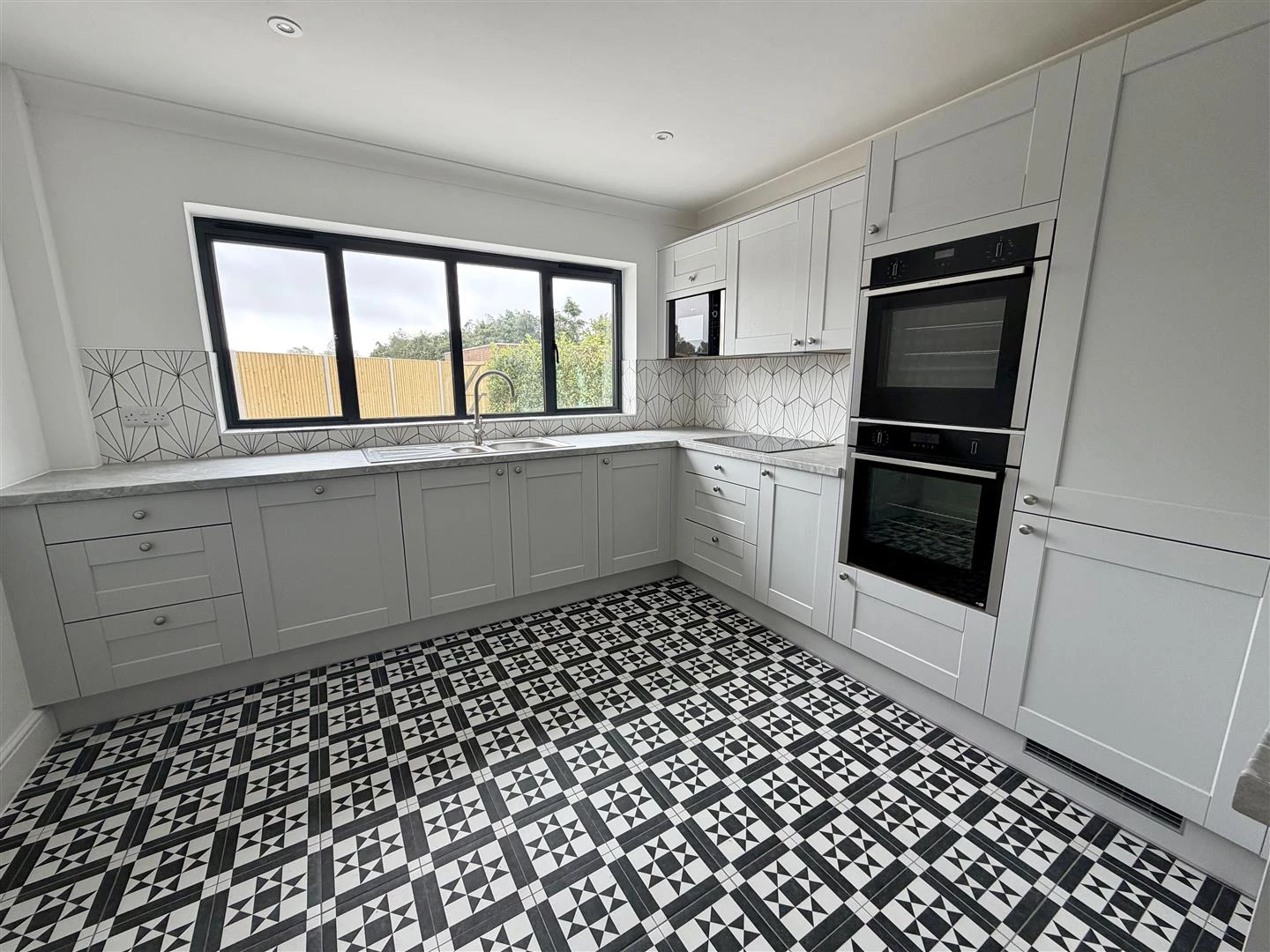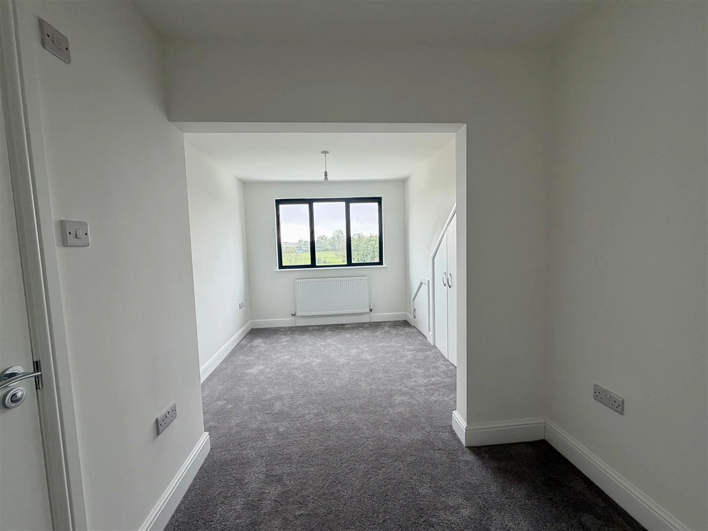 The ground floor features an elegant entrance hall leading into a spacious open-plan living, family, and dining area. This bright and versatile space benefits from three sets of French doors opening onto the garden, creating a seamless indoor-outdoor flow. The contemporary kitchen is fitted with a range of high-end wall and base units, complete with integrated appliances. A separate utility area and a convenient ground-floor WC with shower complete this level.