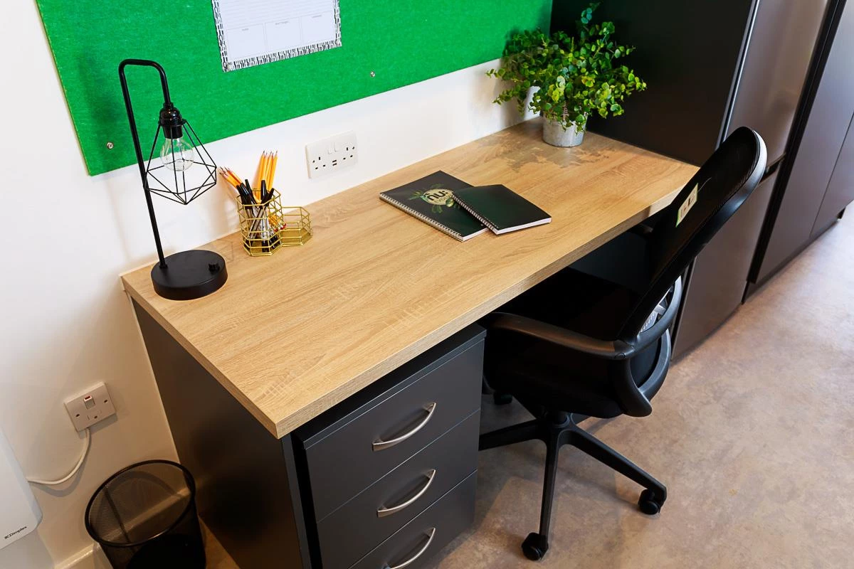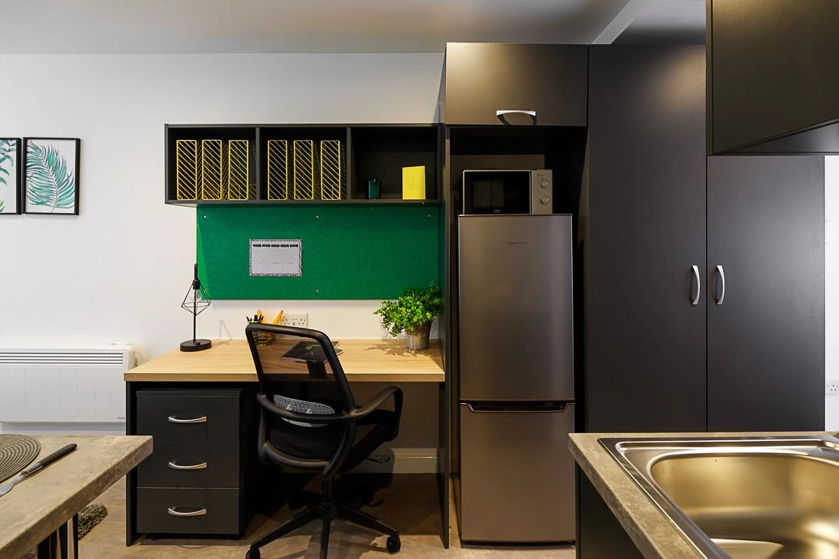 A stylish, one bed studio apartment, fully equipped with a modern kitchen, separate study space, double bed, plenty of storage and en-suite shower room.