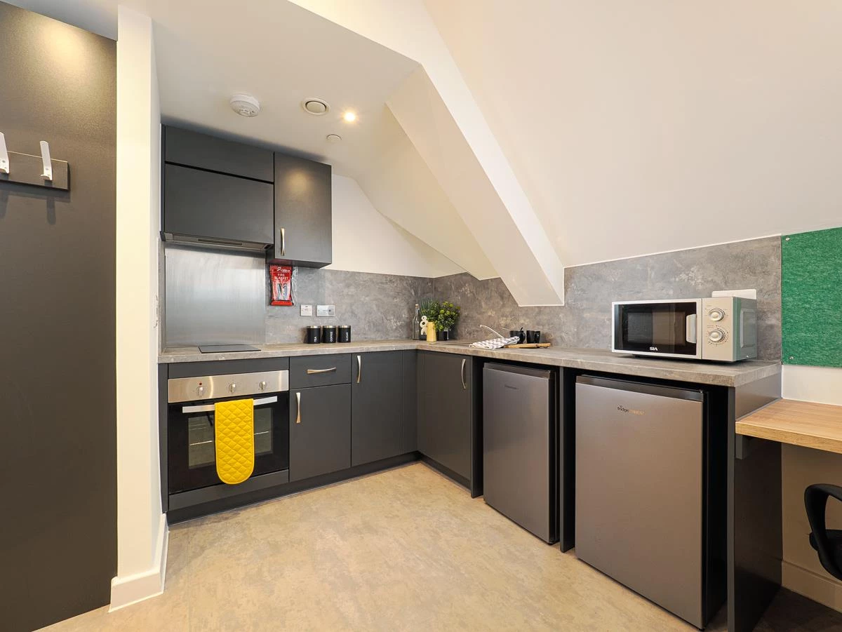 A stylish, one bed studio apartment, fully equipped with a modern kitchen, separate study space, double bed, plenty of storage and en-suite shower room.
