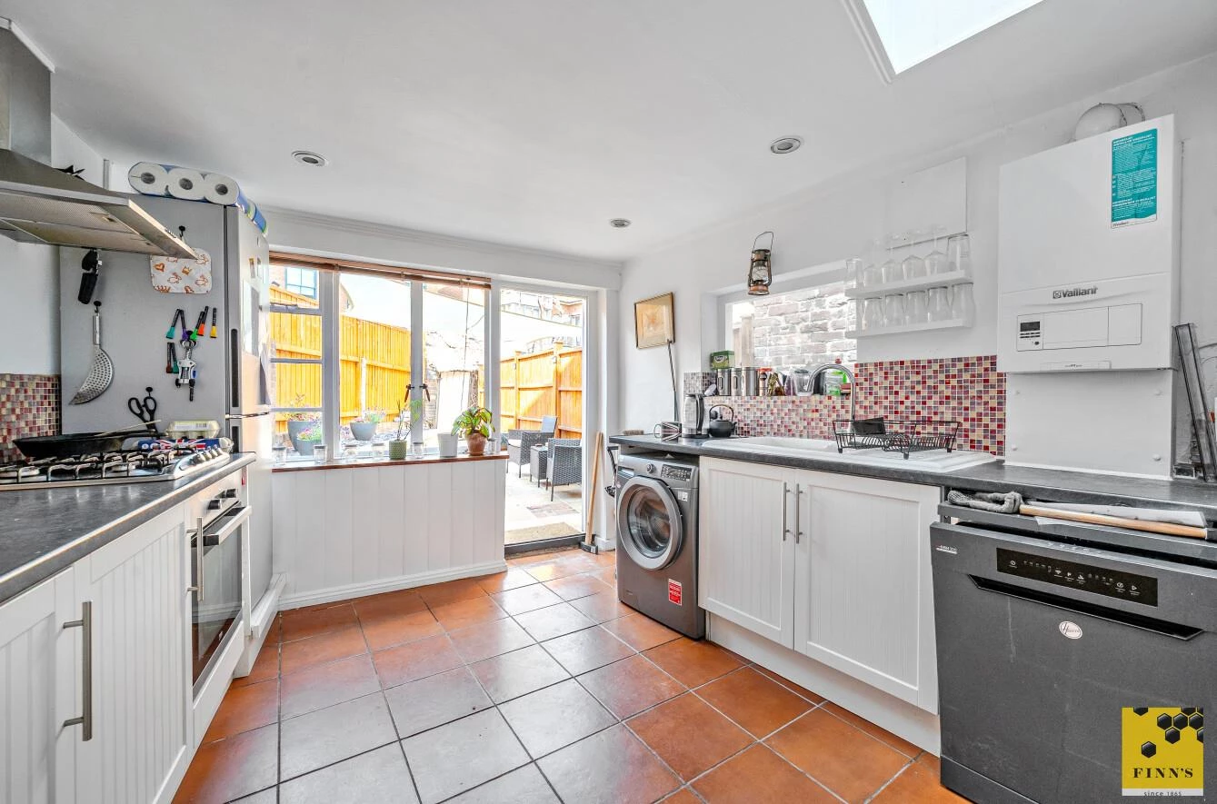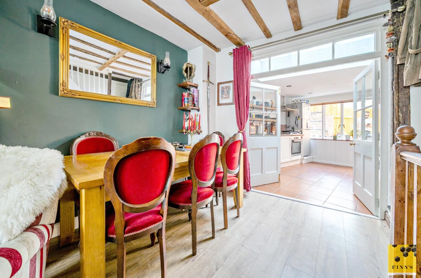 Steps lead up to the front door, opening into a lovely sitting and dining area, complete with a wood-burning stove, exposed brick chimney breast and characterful beams. This space flows into a delightful, light-filled kitchen with a generous range of cupboards and space for appliances. A door leads out to the rear garden, providing a lovely connection between indoor and outdoor living.