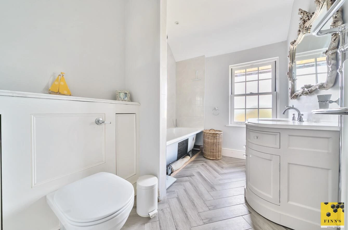 Upstairs are four bedrooms, three of which are generous doubles and all have wonderful views. The main bedroom includes fitted wardrobes with a dressing table space, while the family bathroom is elegantly finished with a roll-top bath and shower over, WC, and washbasin set in a beautiful marble-topped vanity unit.