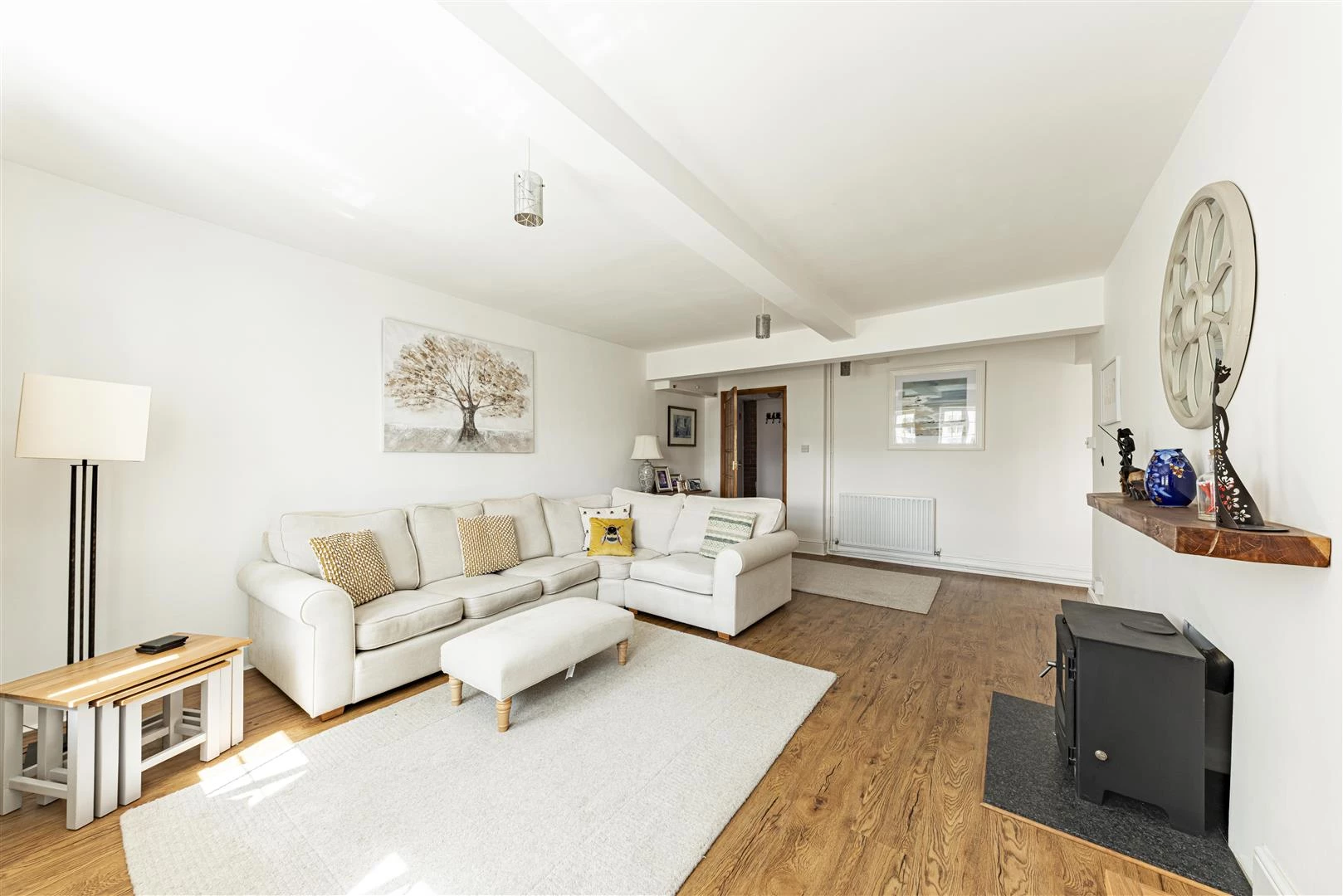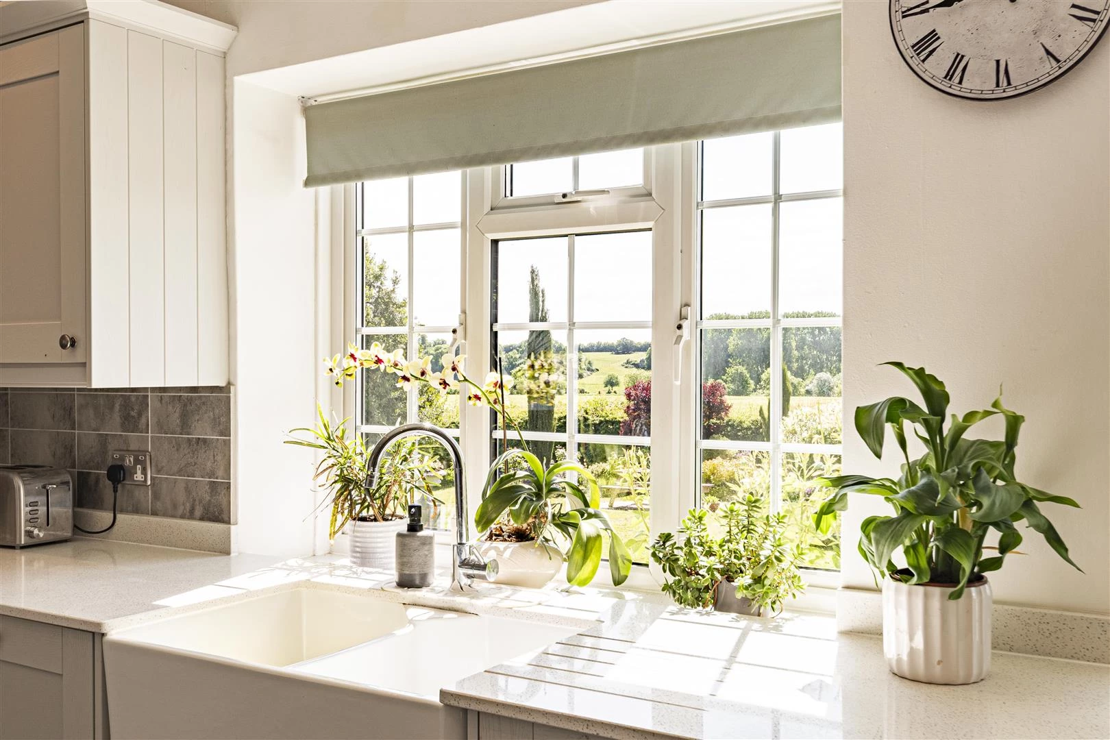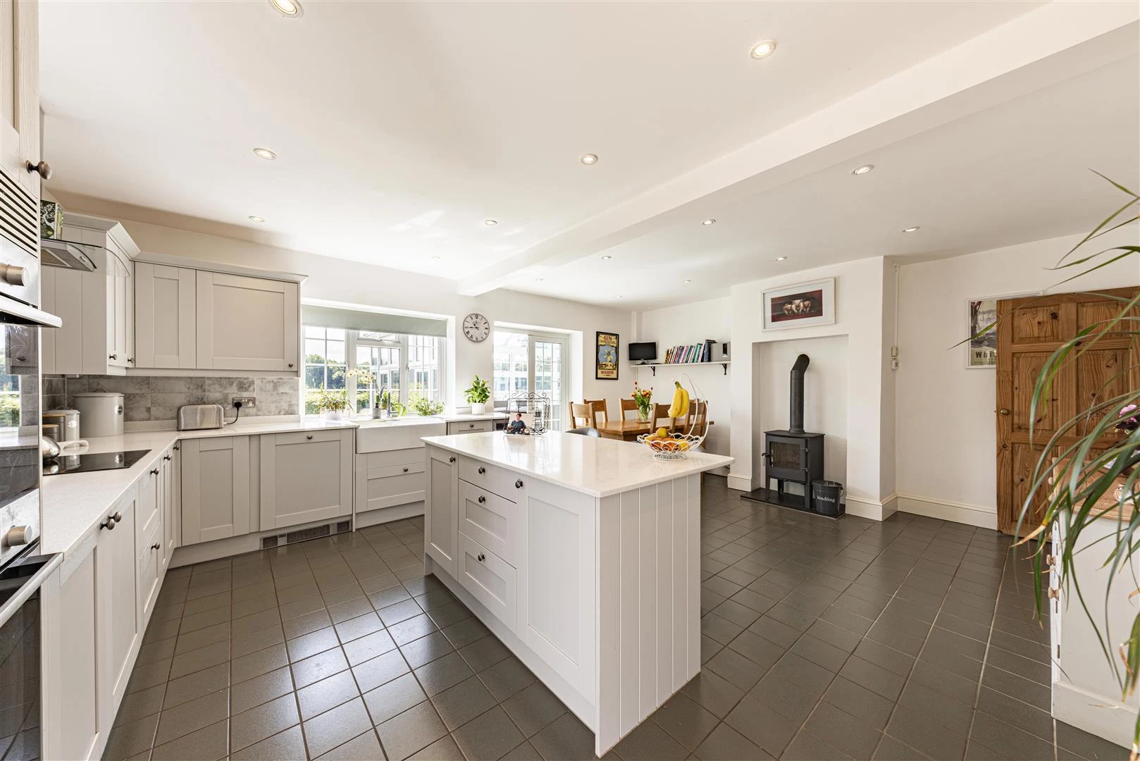 At the heart of the home is a large kitchen and dining area, a warm and inviting space featuring a wood-burning stove, high-quality fitted units with quartz worktops and integrated appliances. From here, you can enjoy panoramic views across the beautifully tended garden and beyond to rolling countryside.