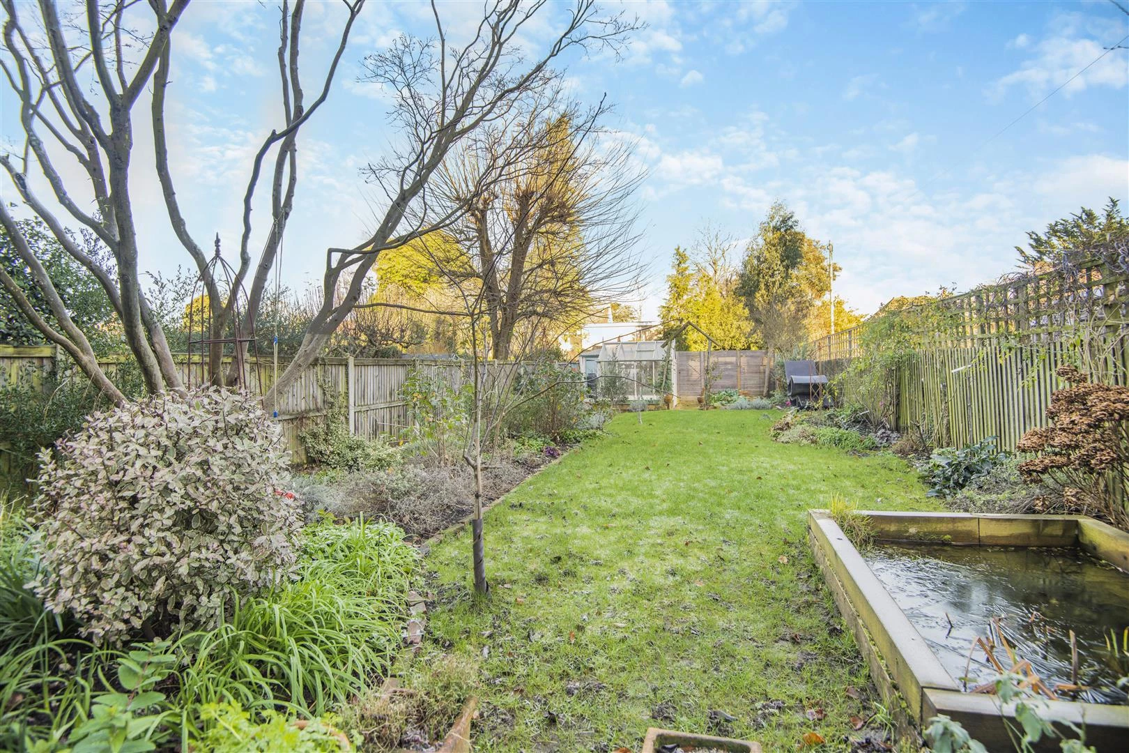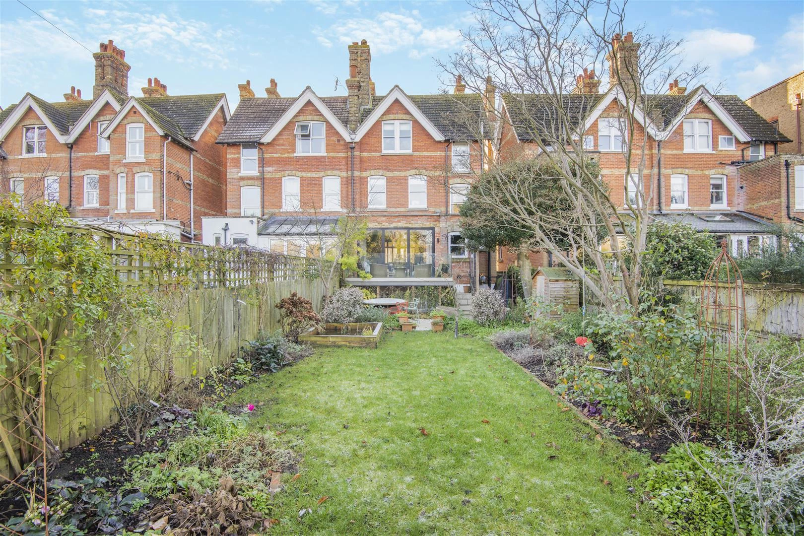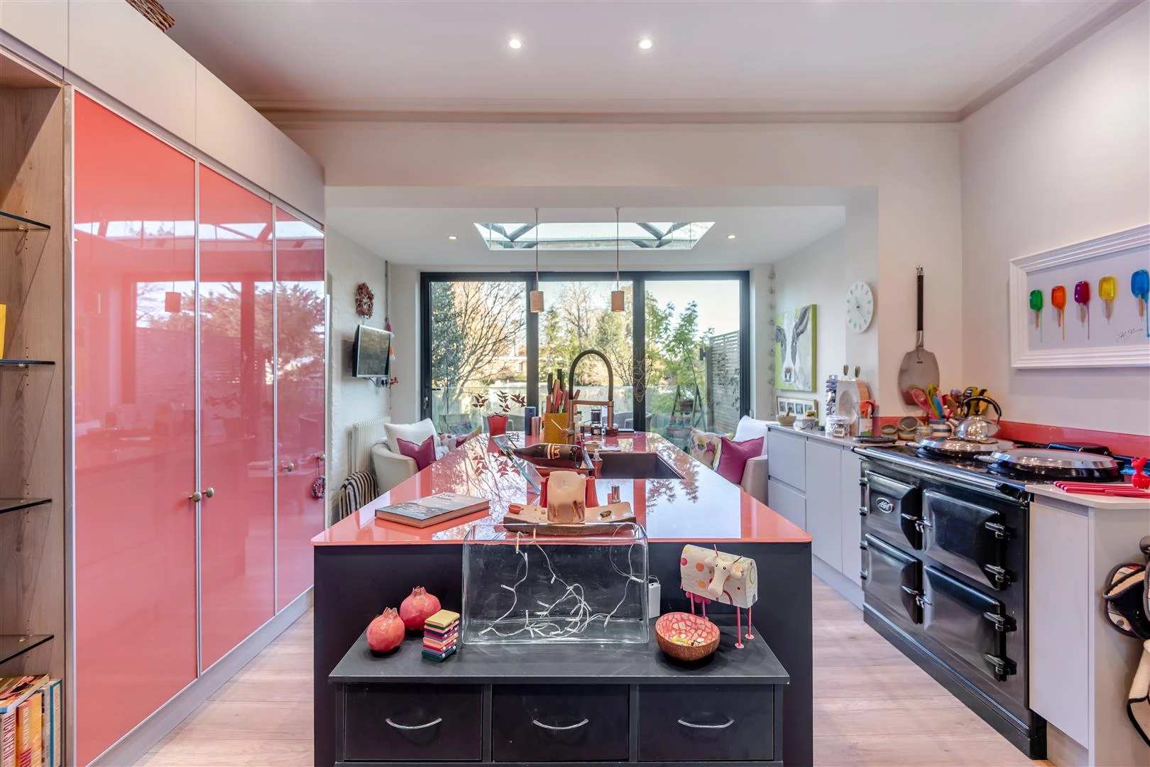 At the heart of the home, the kitchen blends classic and modern design around a large island and Aga, with ample space for dining and relaxing. A roof lantern and full-width bi-fold doors flood the space with light and extend onto a sun-soaked timber deck overlooking the garden.