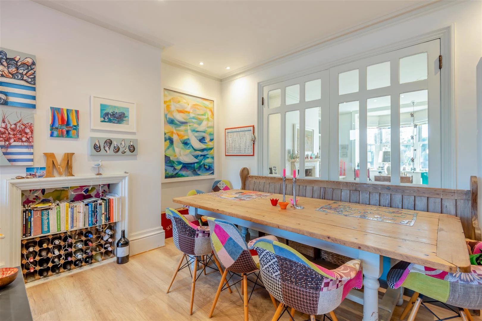 To the front, a light-filled sitting room with a southwest-facing bay window offers charm and comfort, featuring a beautiful open fireplace with fitted shelving and double doors connecting to the impressive kitchen/breakfast room. This open layout gives flexibility to create either distinct living zones or a wonderful entertaining space.