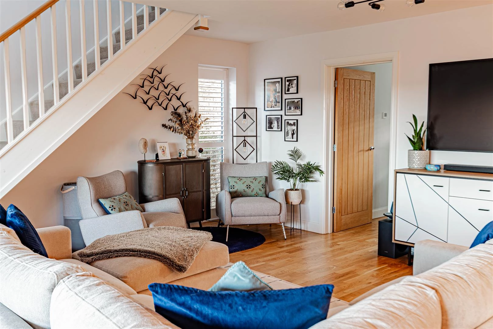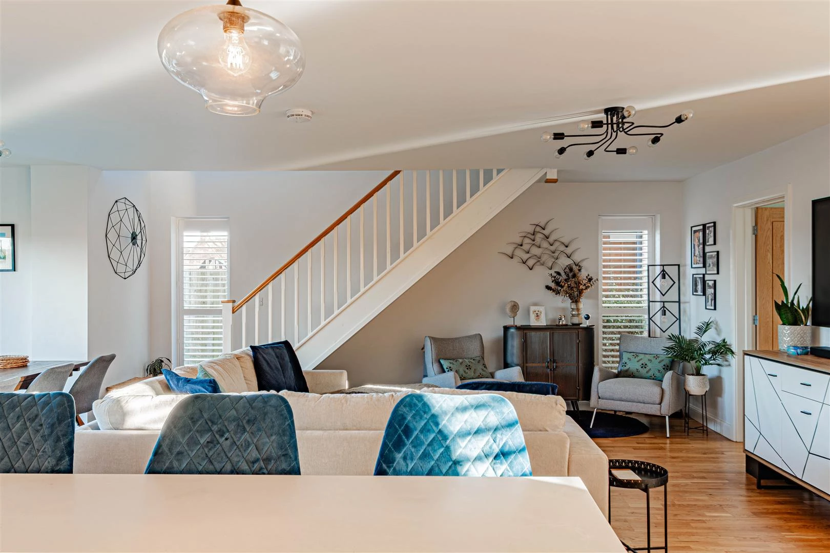 The front door opens into an impressive open-plan kitchen, dining and living space, creating a superb environment for both family life and entertaining. The contemporary kitchen is fitted with gloss units, quartz worktops and a range of integrated appliances, complemented by a separate utility room. The living and dining area is flooded with natural light, enhanced by bi-folding doors that open directly onto the landscaped rear garden. To the front of the house there is a dedicated home office, along with a beautifully appointed downstairs cloakroom.