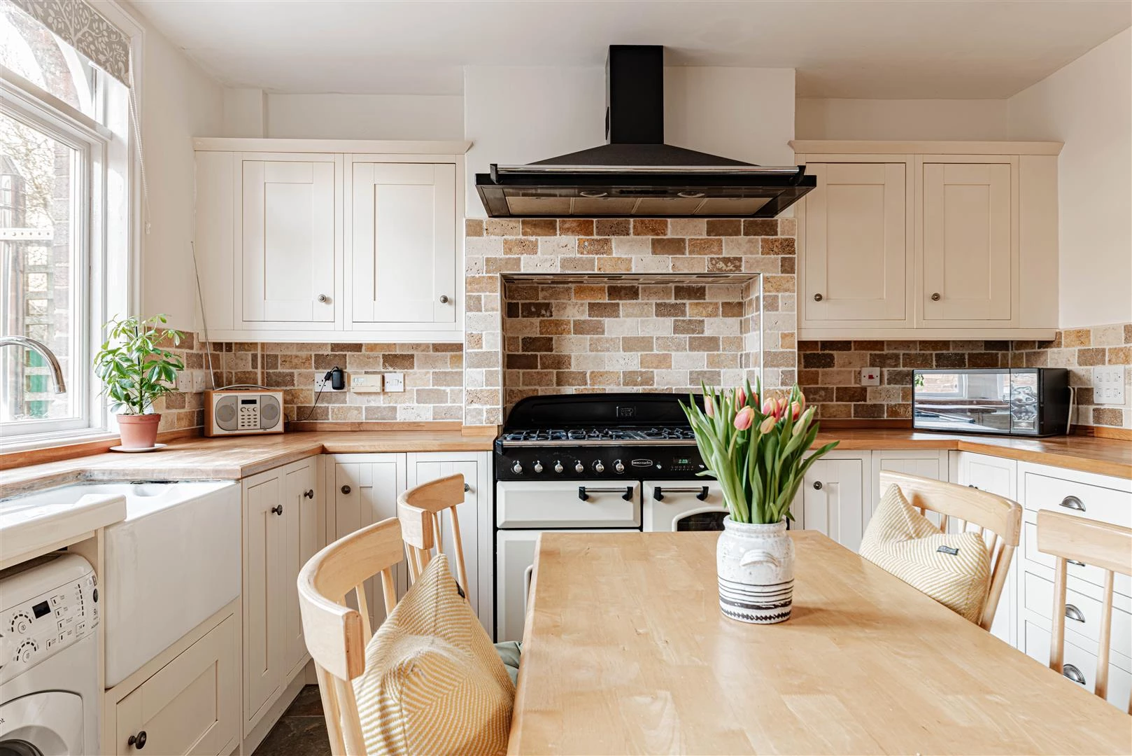 To the rear, the kitchen/dining room offers generous space for a family dining table and benefits from under floor heating, a good range of wall and base units, a butler sink and a rangemaster cooker with spaces for a washing machine and fridge/freezer.