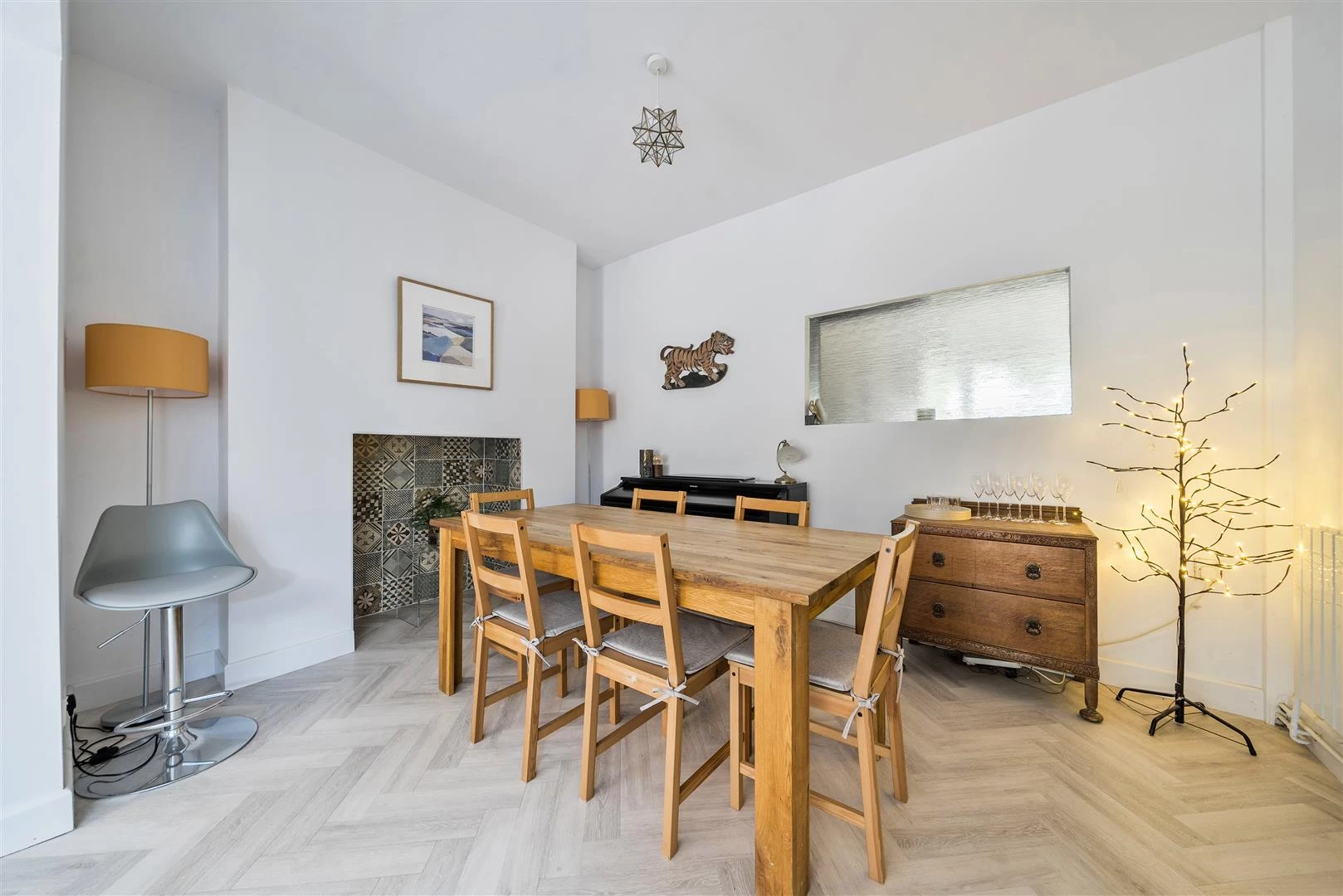 Set back from the road behind its pretty front garden and off-road parking, the front door opens to the porch and thought to the sitting room with timber flooring and a lovely exposed brick fireplace, complete with a wood-burning stove.