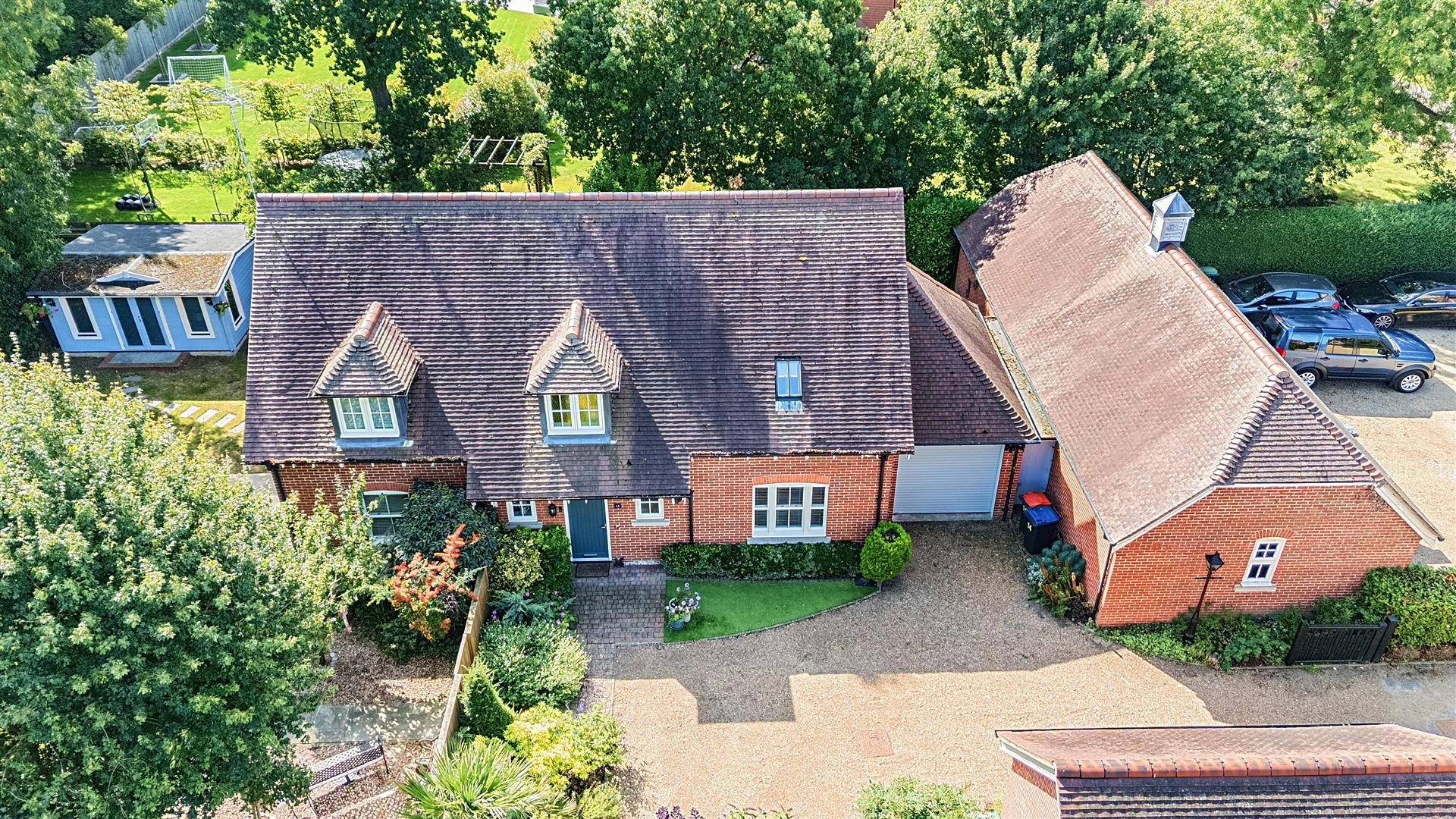 Outside, the property occupies a desirable corner plot, providing a high degree of privacy. There is ample off-road parking, a garage and a beautifully landscaped rear garden extending to approximately 113’ x 71’. The garden is well stocked with established trees and shrubs, paved seating areas, a generous lawn, and a detached summer house – ideal for conversion into a home office or studio.