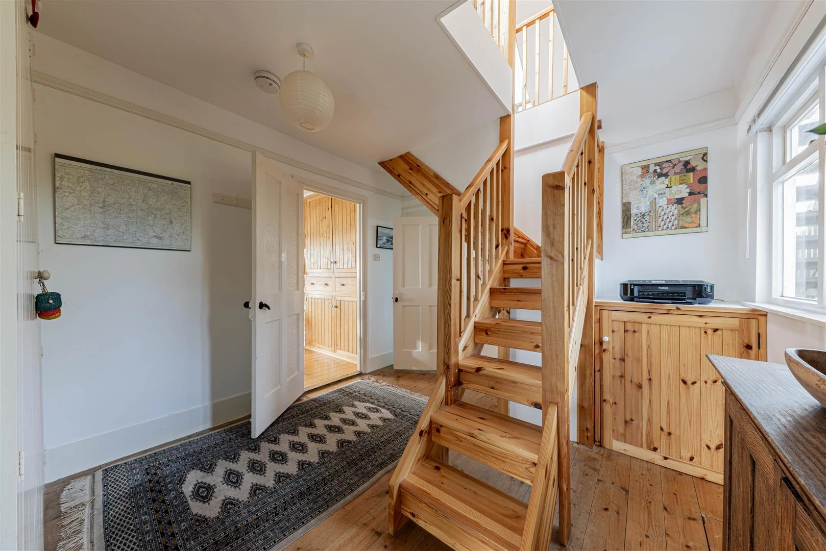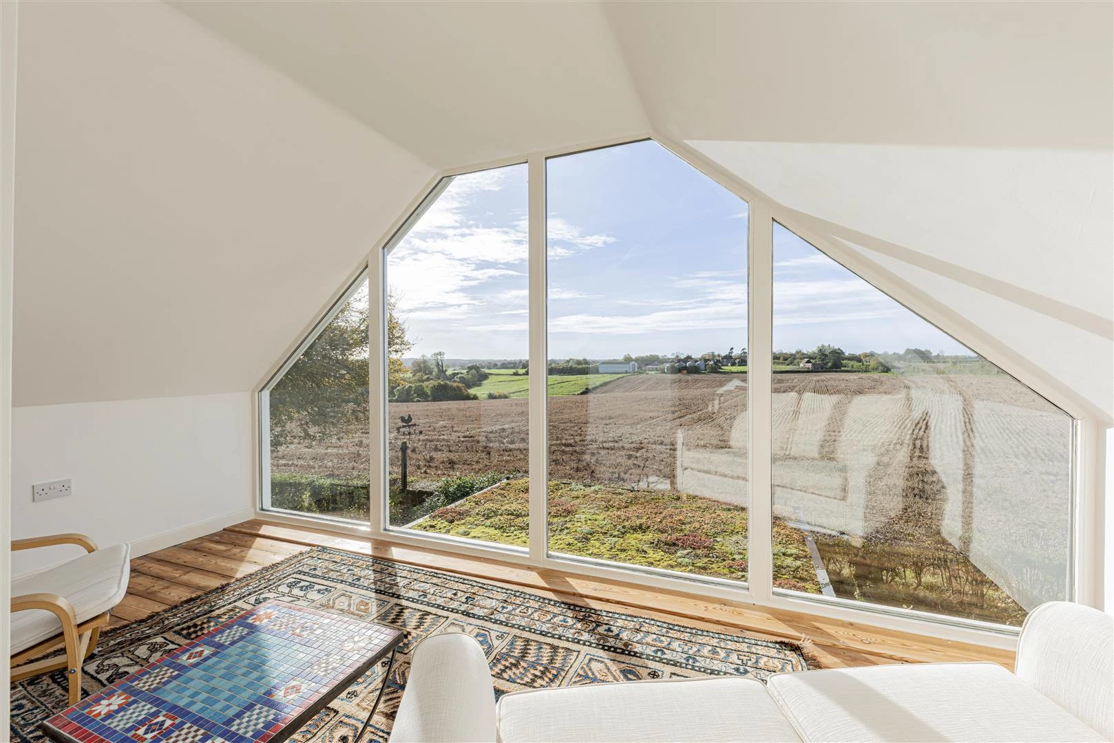 Upstairs, the glazed gable-end sitting room/bedroom is the showpiece of the house, its wide picture window frames a stunning view over the North Downs National Landscape and the attractively planted roof below. This versatile space could be used as a bedroom or sitting room and benefits from external stairs providing separate access, offering flexibility for guests.