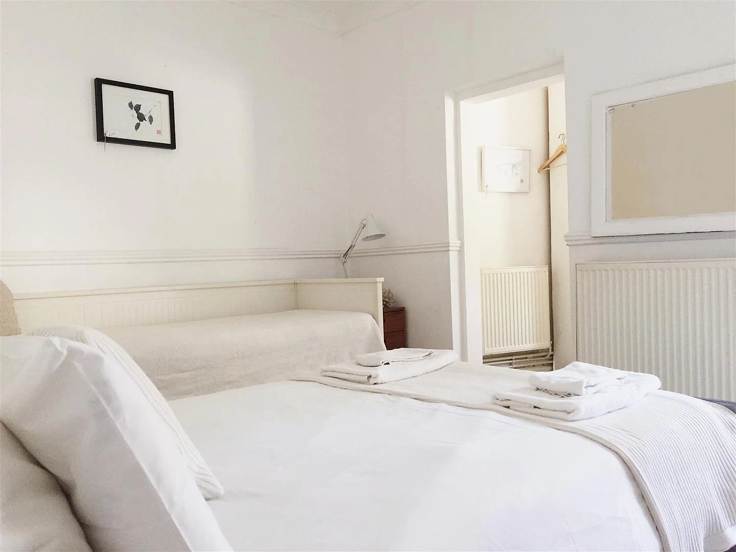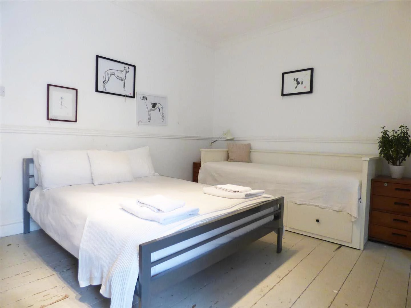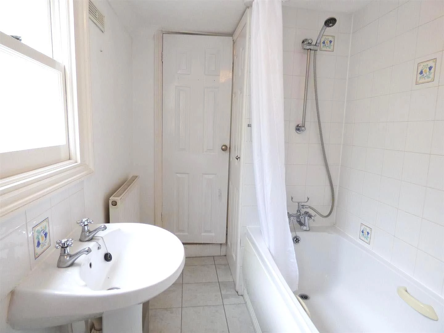This accommodation is arranged on one floor and begins in an entrance hall shared with the upstairs flat. The home’s private internal door opens onto a good size sitting/dining room with exposed floorboards and large Victorian bay window.