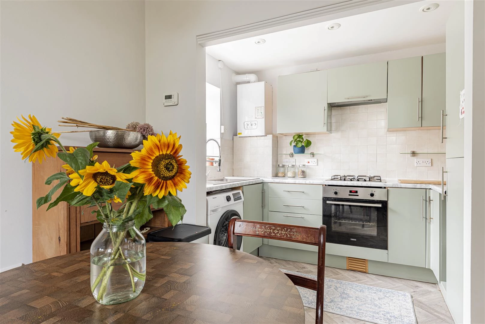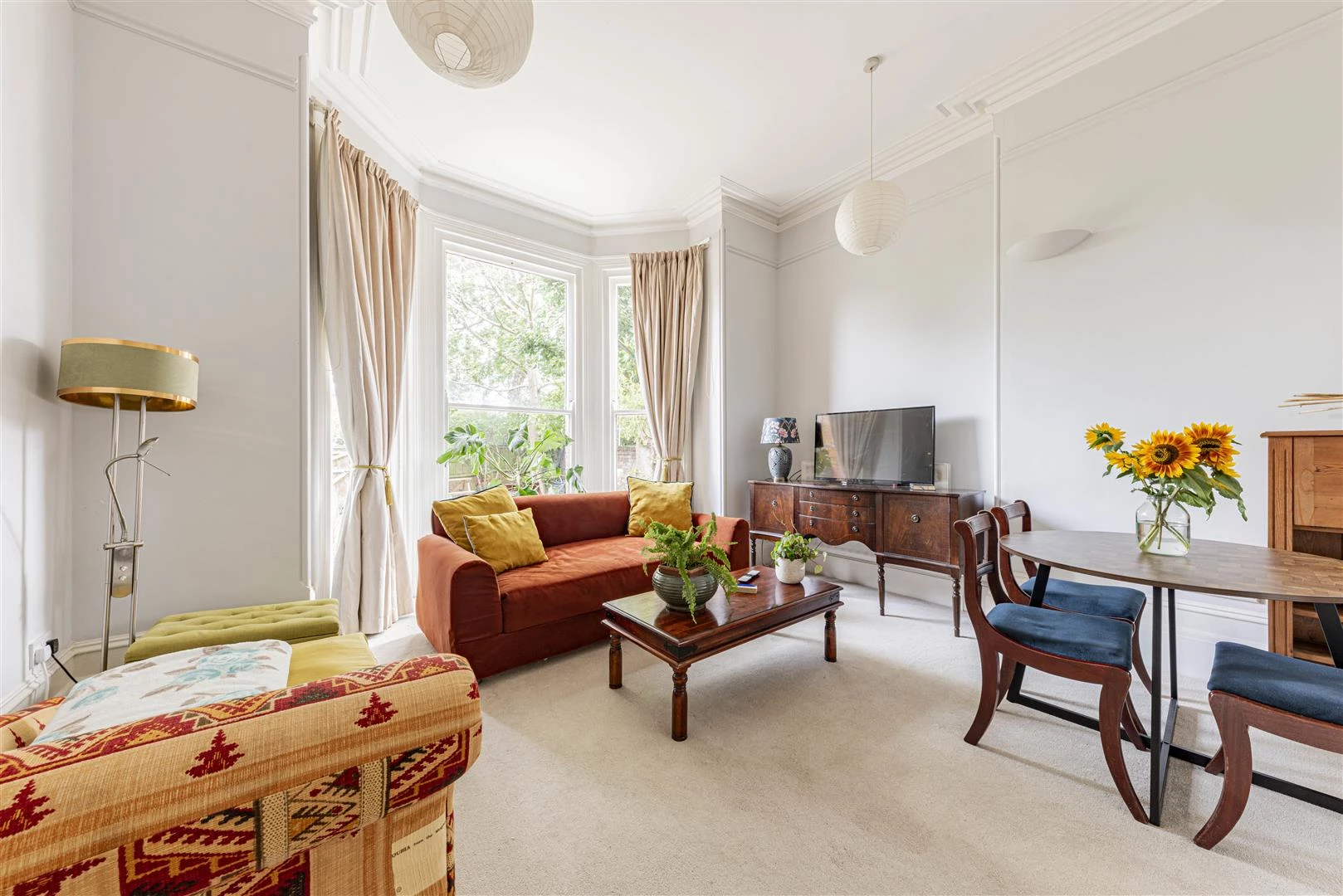The front door opens to the communal hallway and the entrance to Flat 2 is on your right hand side. The front door opens to the entrance hall which benefits from built in storage and through to the sitting room. The first thing which strikes you is the wonderful proportions, with high ceilings and an elegant floor to ceiling bay window which overlooks the pretty back garden. The kitchen is fitted with a good range of wall and base units and has an electric oven, a gas hob and spaces for other appliances.
