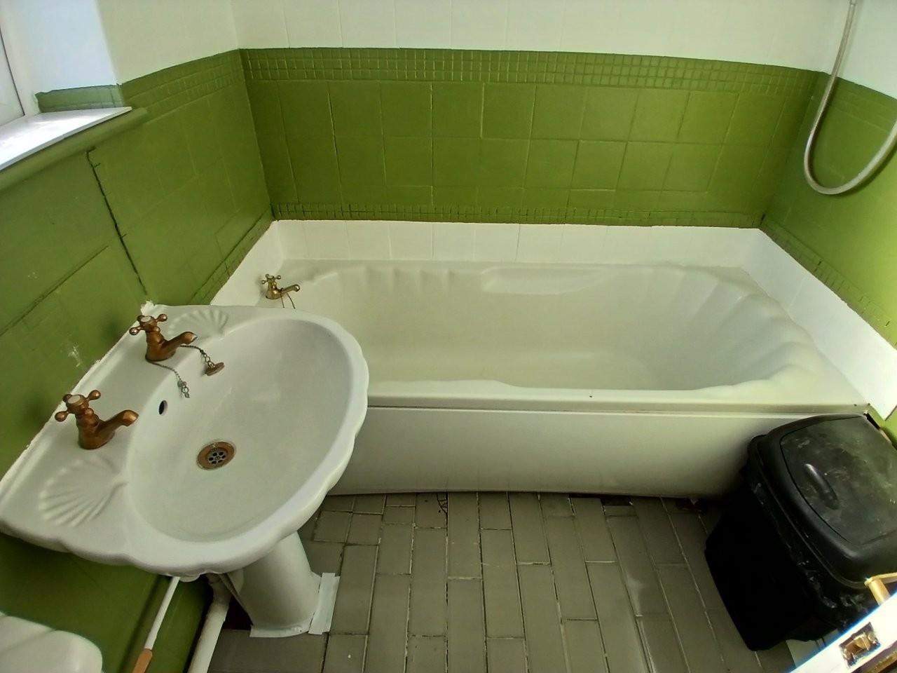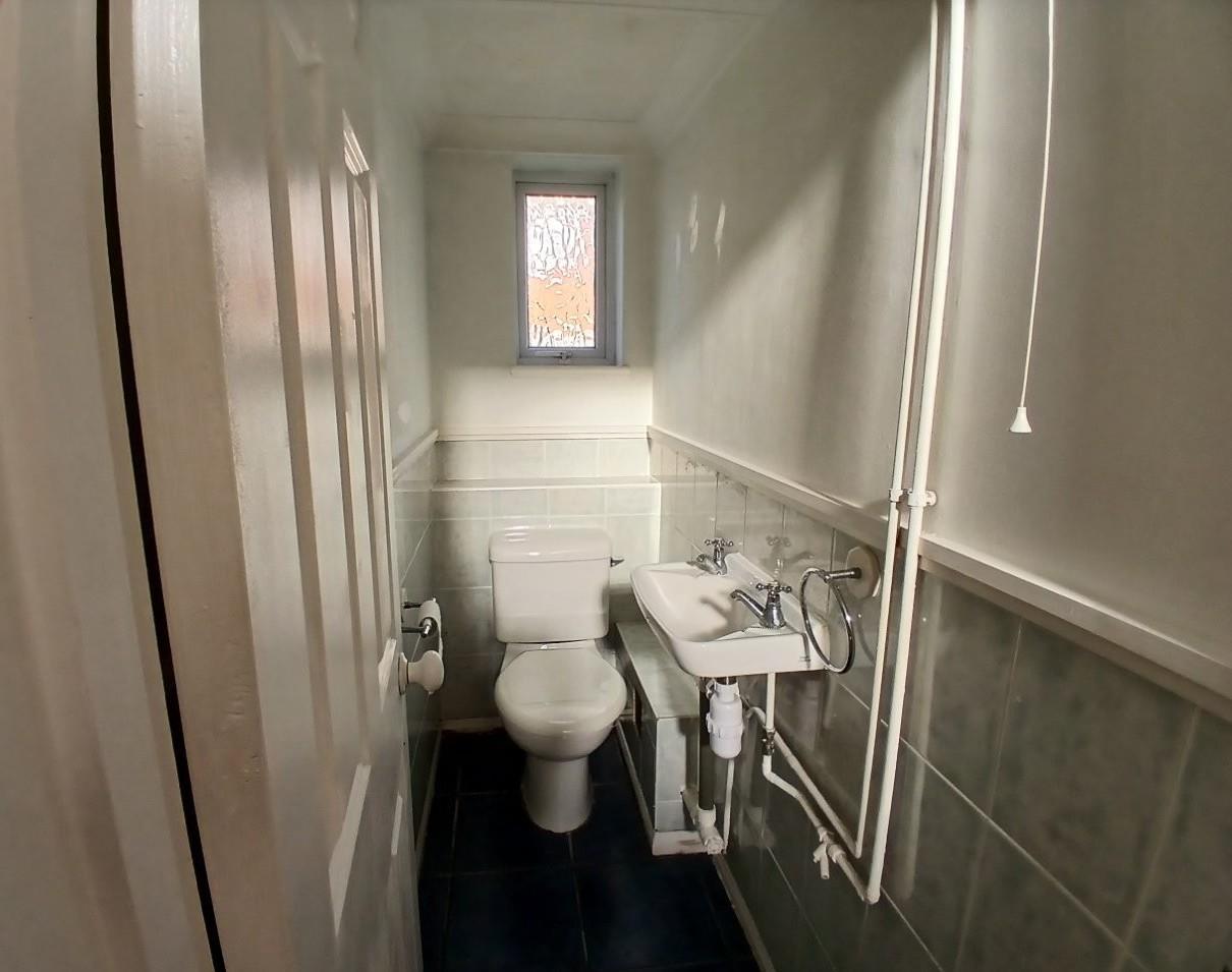 White suite comprising paneled bath with shower over pedestal wash hand basin WC radiator, wall tiling and double glazed window to the rear.