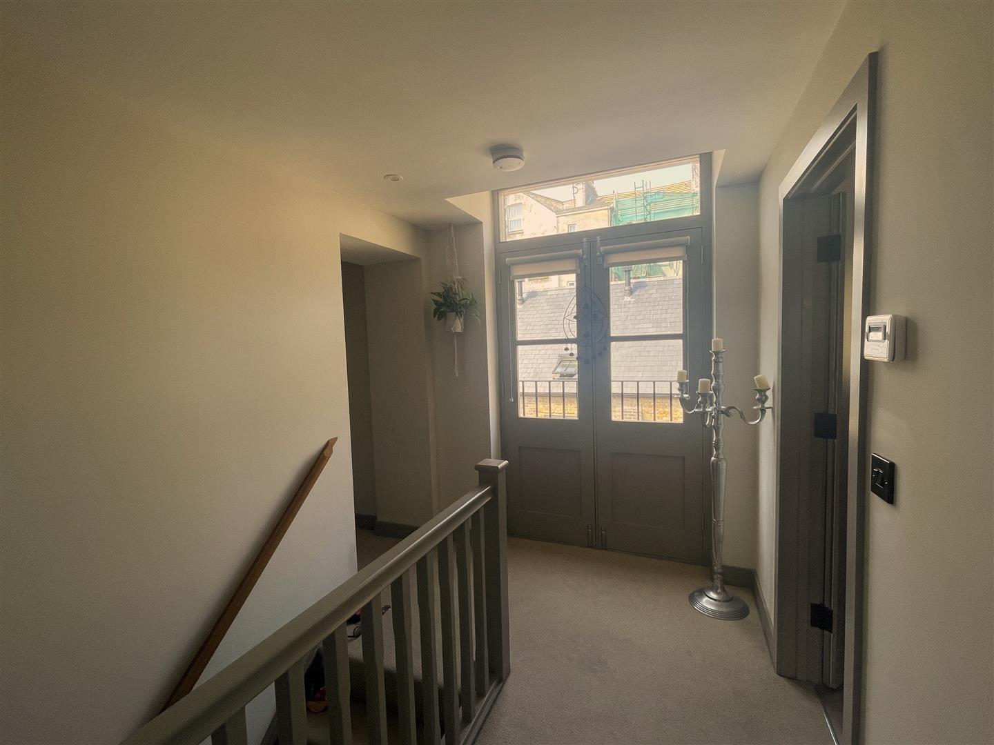 Carpeted stairs and landing, double doors with blinds to Juliet Balcony, inset lights, radiator.