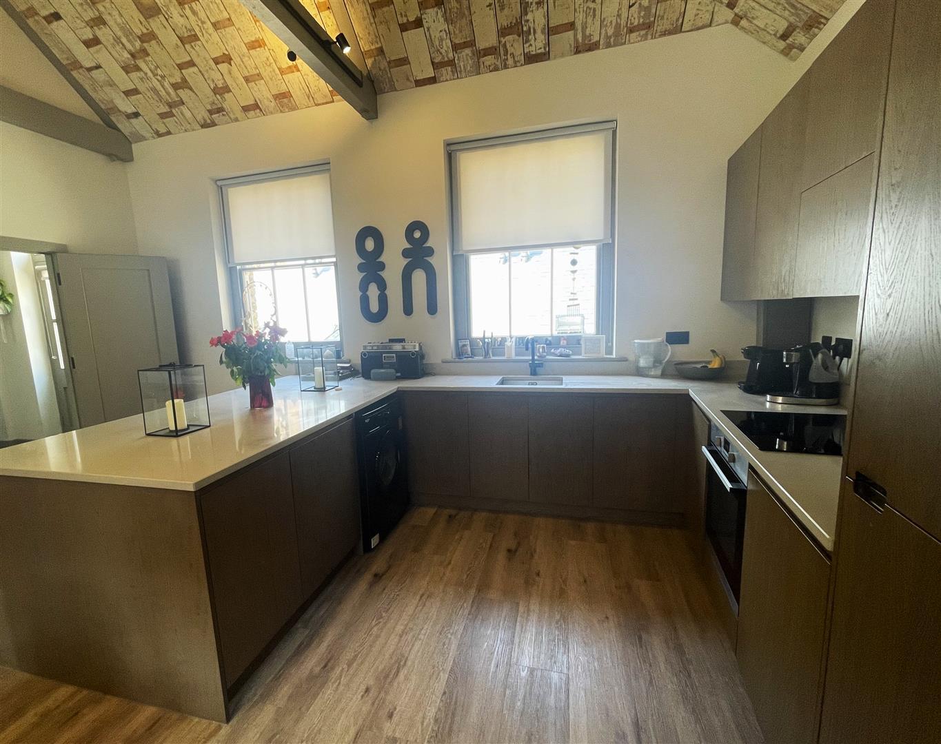 Fully fitted kitchen with handmade wood effect walnut wall and base units, Quartz worktops. Inbuilt single sink and drainer with mixer tap. Integrated appliances including Neff ceramic induction hob. electric fan assisted oven and extractor hood, Neff dishwasher and Integrated Hotpoint fridge/freezer. Karndean Alaskan oak flooring throughout, 2 radiators. original sash windows with roller blinds, track lighting.