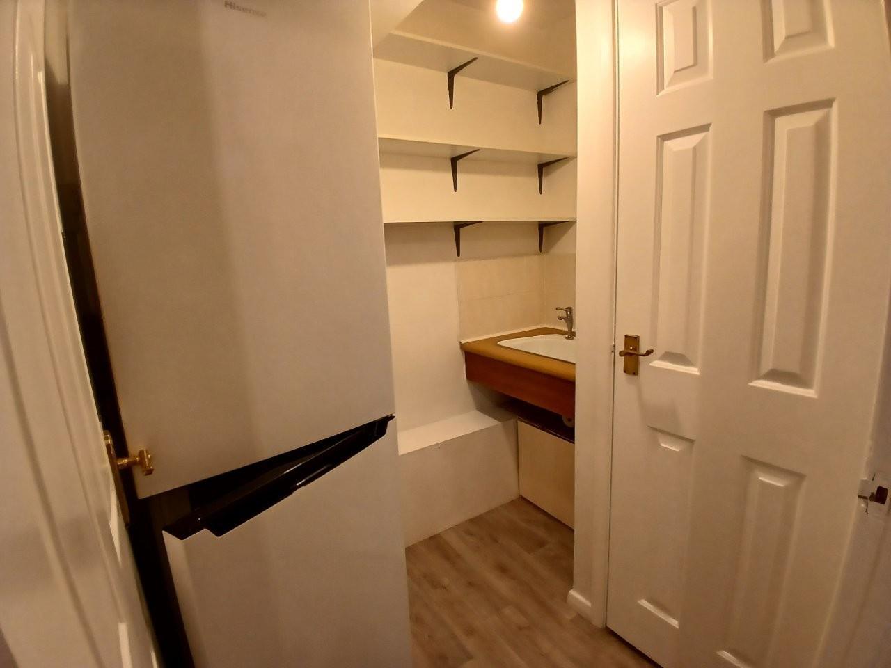 Sink unit, plumbing for dishwasher, shelved area, airing cupboard housing hot water cylinder and water softener.