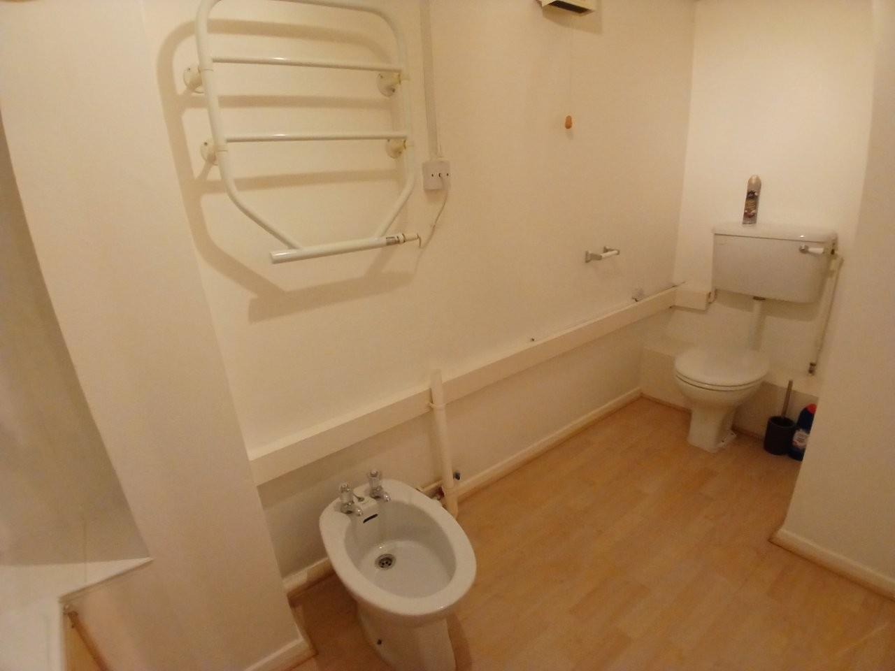 Fitted white suite with panelled bath, low level wc, bidet, pedestal wash hand basin, electric wall heater, electric towel rail, plumbing for washing machine, laminate flooring, part tiled walls.
