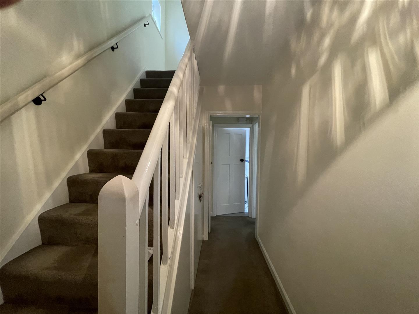 Fitted carpet, telephone point and large under stairs storage cupboard housing Valiant gas fired combination boiler providing central heating and hot water. Glazed panelled door through to –
