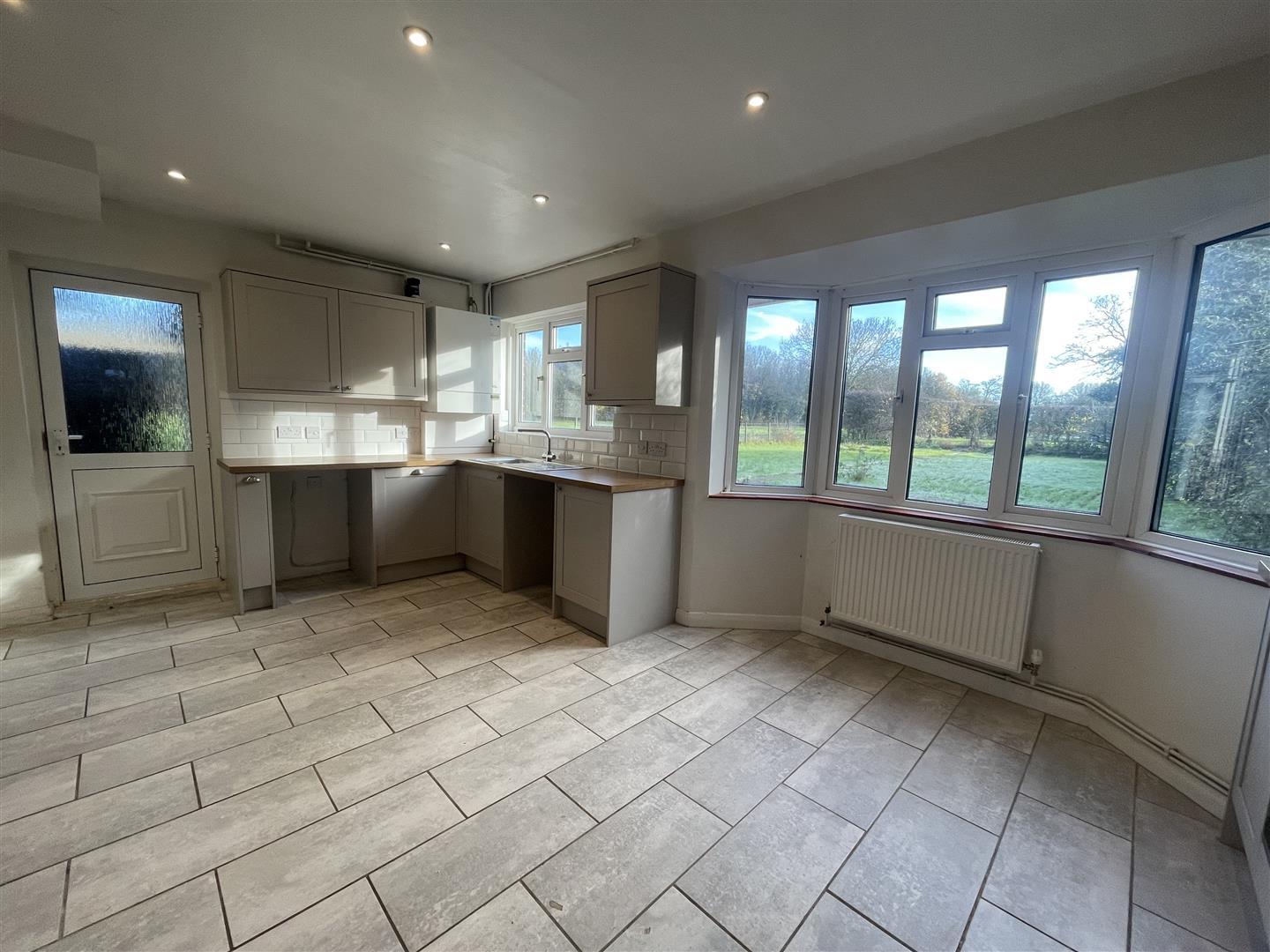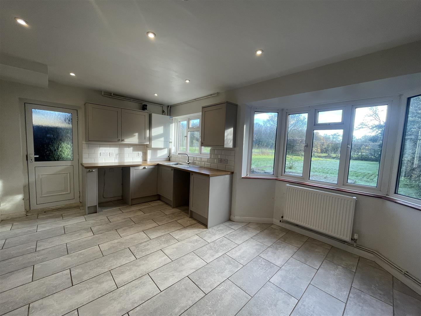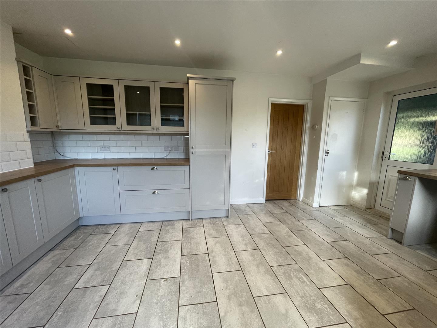 A range of grey wall and base units with wood effect worktops and tiled splashback, integrated fridge/freezer, oven, hob and extractor hood, sink with drainer and mixer tap, under counter space for washing machine/dishwasher/tumble dryer, tiled floor, UPVC double glazed windows and door leading to back garden, inset lighting, oil fired gas boiler, radiator.