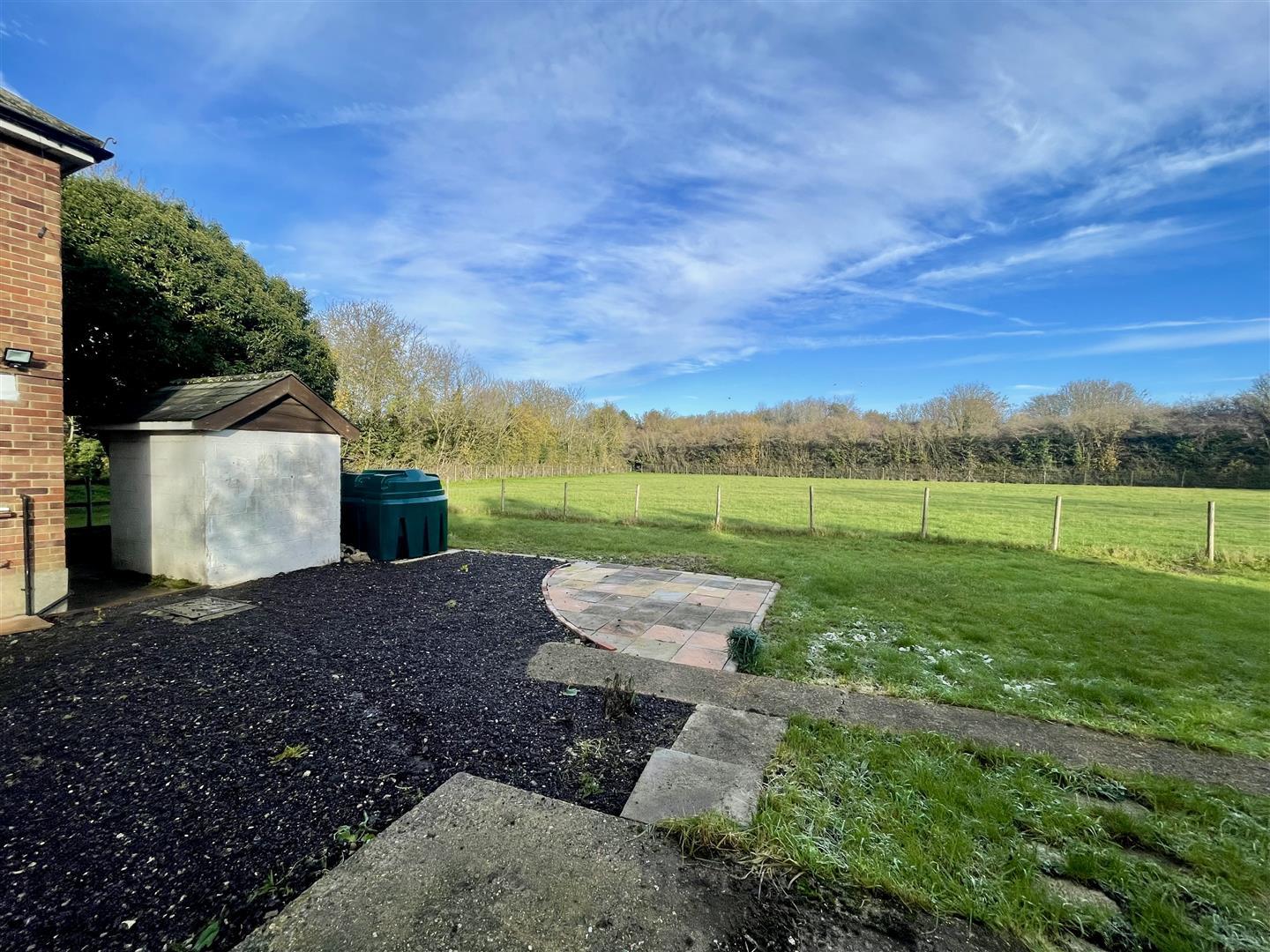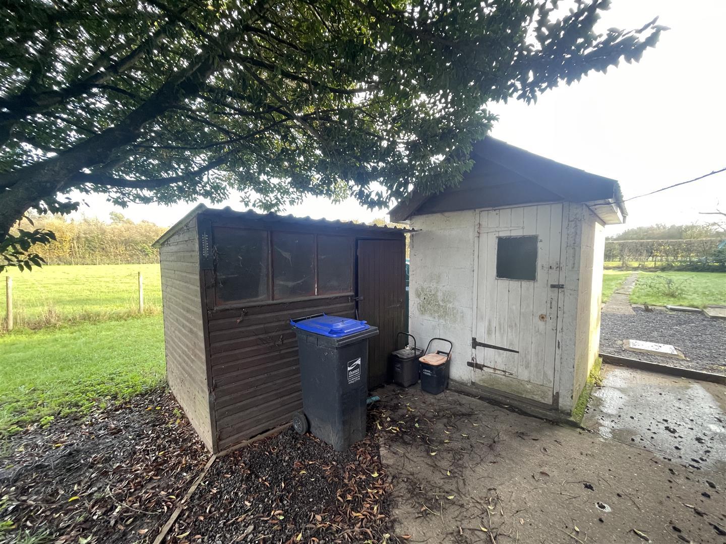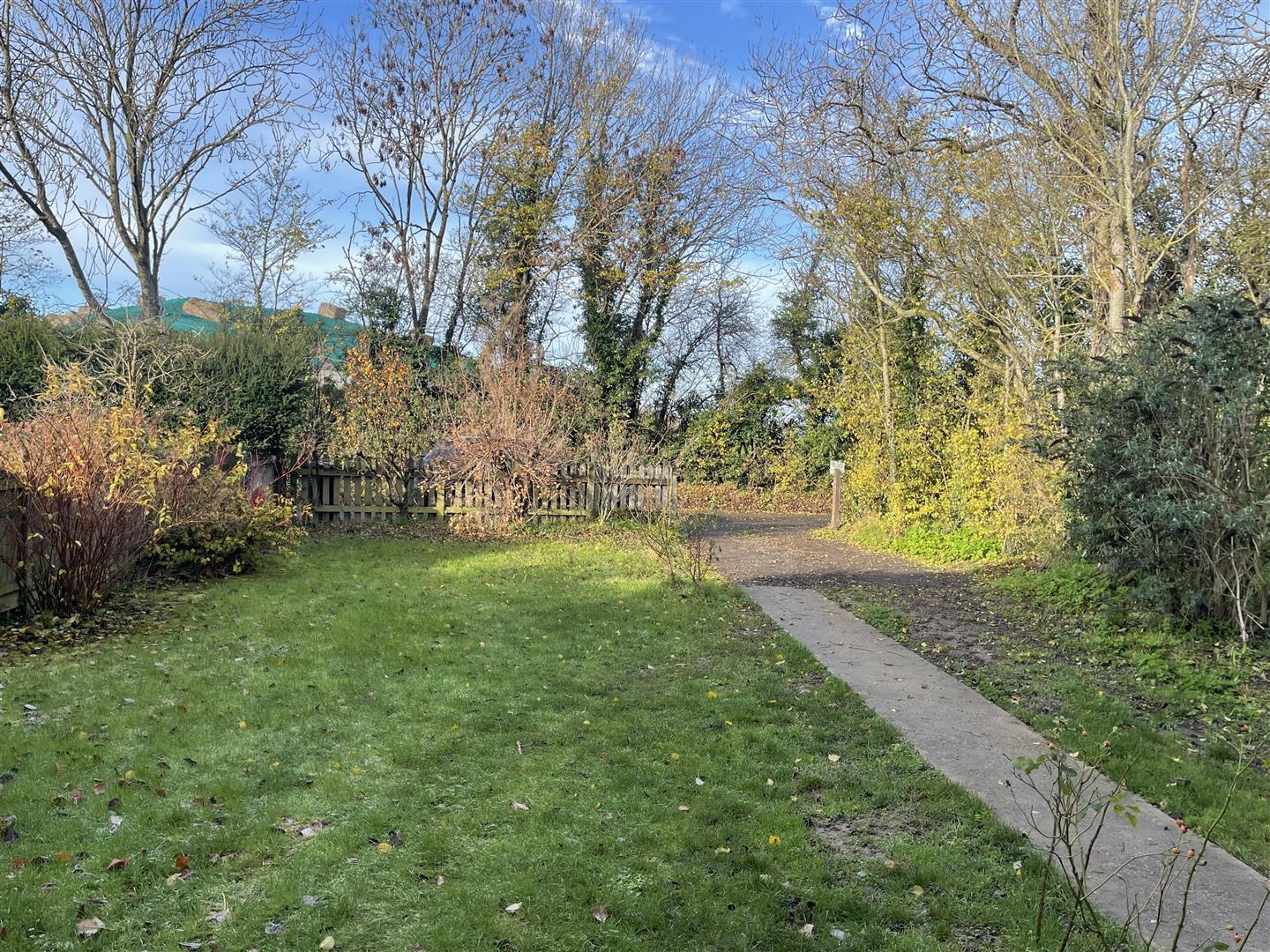 A range of grey wall and base units with wood effect worktops and tiled splashback, integrated fridge/freezer, oven, hob and extractor hood, sink with drainer and mixer tap, under counter space for washing machine/dishwasher/tumble dryer, tiled floor, UPVC double glazed windows and door leading to back garden, inset lighting, oil fired gas boiler, radiator.
