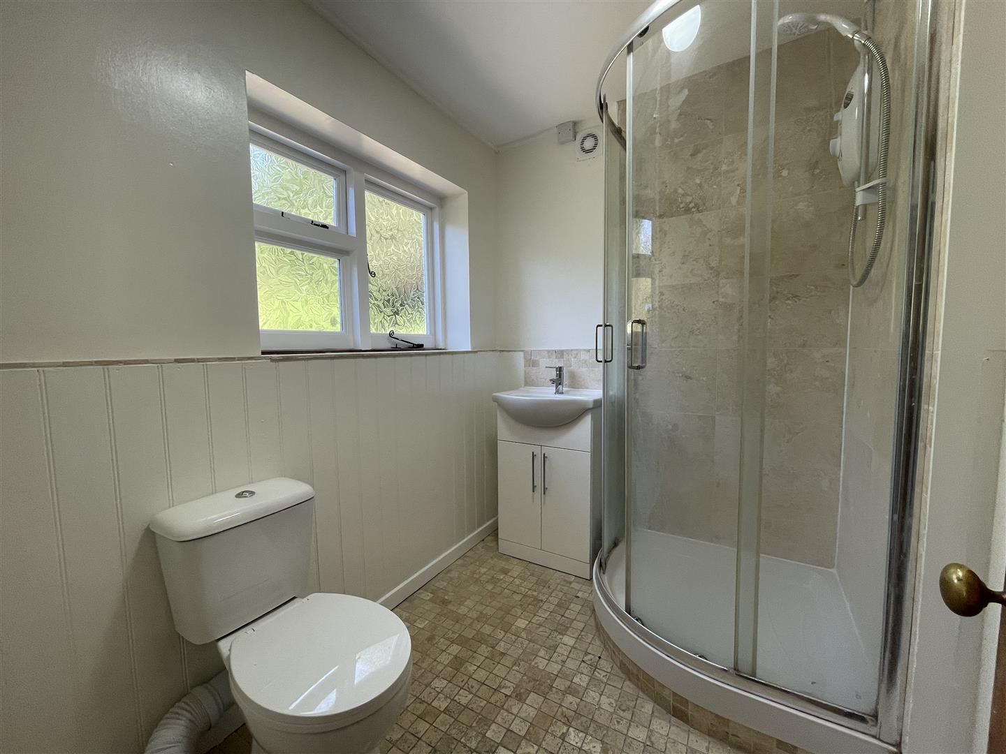 Shower cubicle with new electric shower and tiled walls, new sink built into a vanity unit with storage, WC, heated towel rail, extractor fan, window with privacy glass, tiled floor.