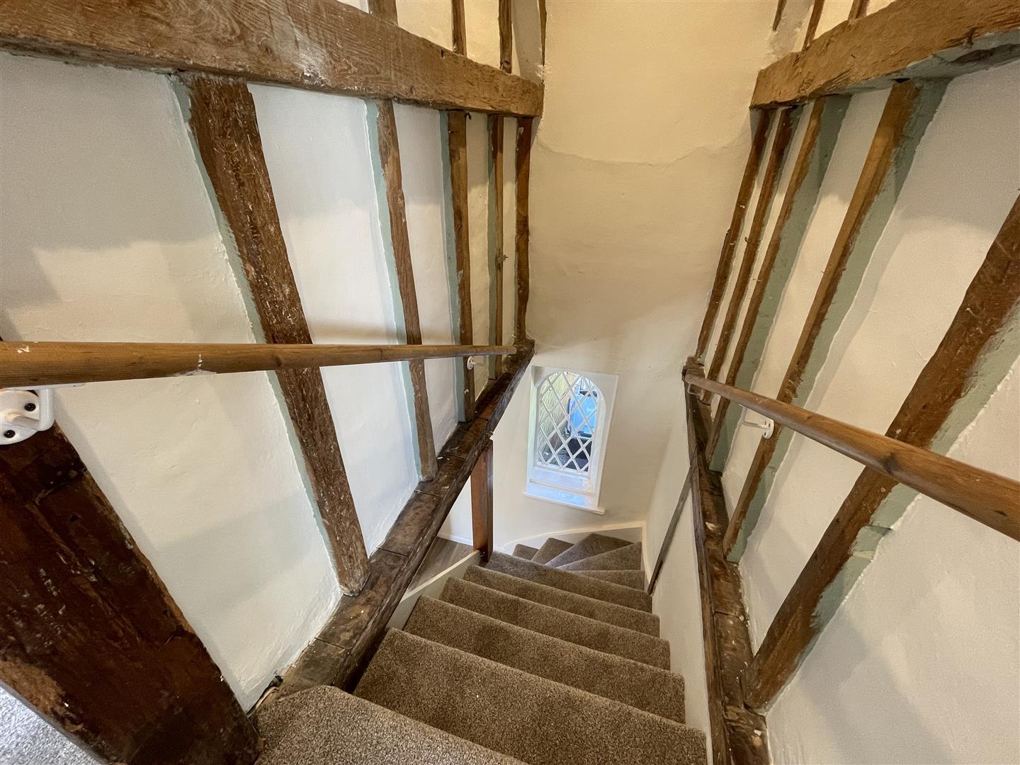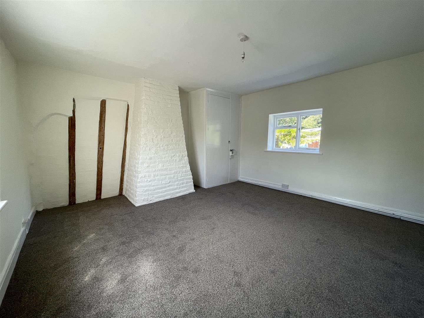 Recently redecorated and newly carpeted, traditional brick fireplace with woodburning stove, exposed beams, storage cupboard and shelving, French doors to the garden, cottage style windows with secondary glazing to front, high retention electric heaters.